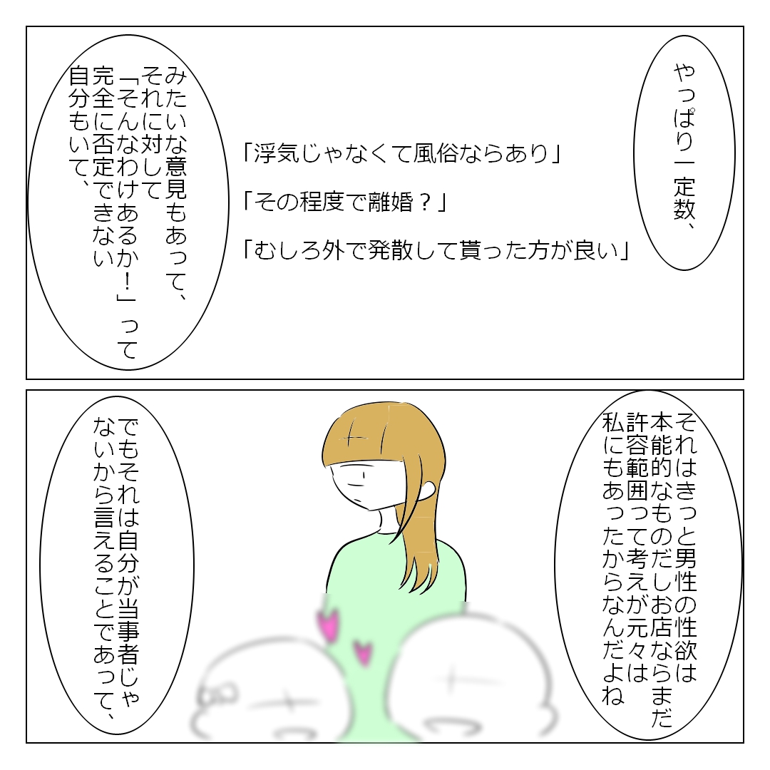 だからこそ風俗通いが発覚した時にスパッと「はい、無理。離婚する。」という決断もできなかったし、